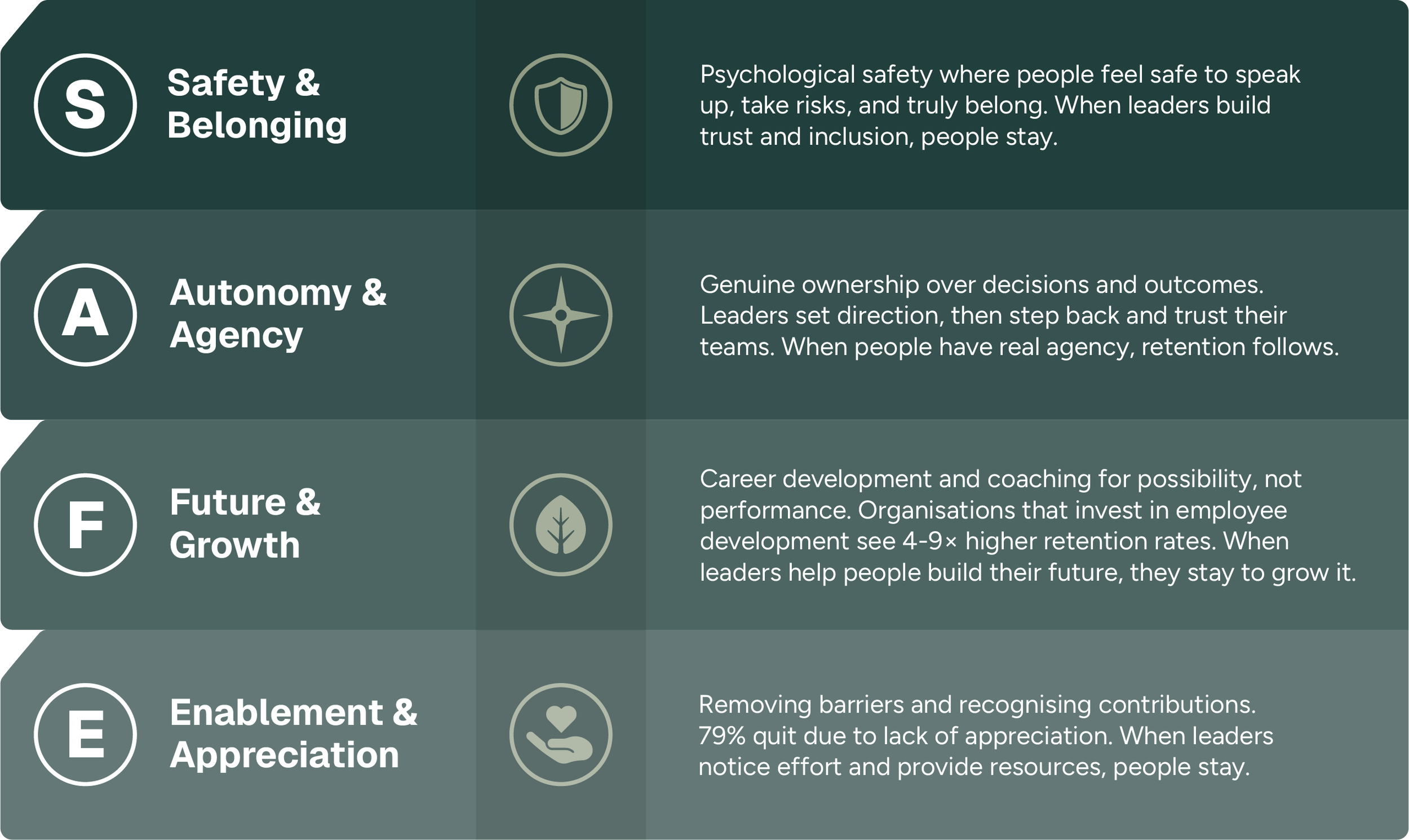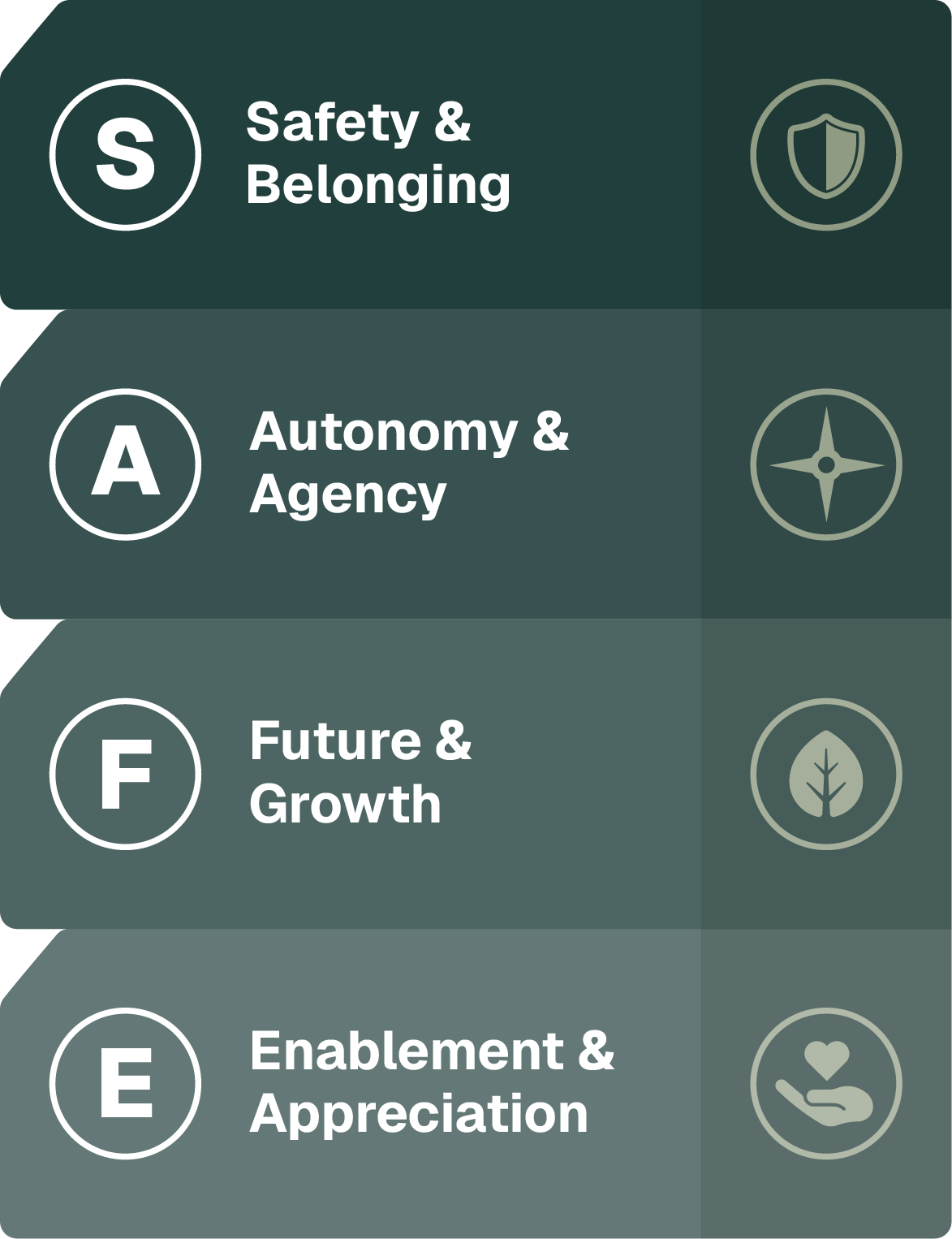 SSL Flagship Program is a 6-month leadership capability program that addresses the single biggest driver of retention - developing leadership capability in leaders who create environments where people choose to stay. Using the SAFE framework - built on the four primary predictors of retention - leaders create psychologically safe, high-performance environments where people thrive.